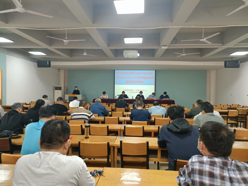 4月26日下午, 创新创业学院(工程训练中心)在学院(中心)四楼多媒体教室组织学习贯彻习近平总书记在中国人民大学考察调研时的重要讲话精神,全体教职工参加学习,会议由党总支书记张光胜主持。