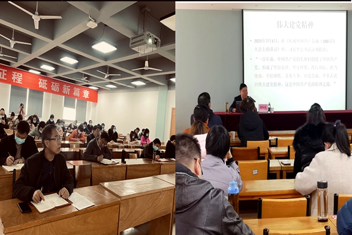 郑小九教授首先从大家所熟悉的“河南人精神”“焦作人精神”“河南理工大学核心价理念”引出中国共产党的精神谱系,对伟大建党精神的形成、内涵、地位及践行四个方面进行了系统全面地解读。他在报告中指出,伟大建党精神是坚持把马克思主义同中国具体实际相结合、同中华优秀传统文化相结合的产物;中国共产党在长期艰苦卓绝的革命斗争中形成了坚持真理、坚守理想,践行初心、担当使命,不怕牺牲、英勇斗争,对党忠诚、不负人民的伟大建党精神,这是中国共产党的精神之源;伟大建党精神贯穿百年党史全过程,贯穿整个党的精神谱系,是中国共产党人精神谱系的高度凝练。他最后强调,全体共产党人要以习近平新时代中国特色社会主义思想为指引,积极践行共产党人的初心和使命,传承和弘扬伟大建党精神。