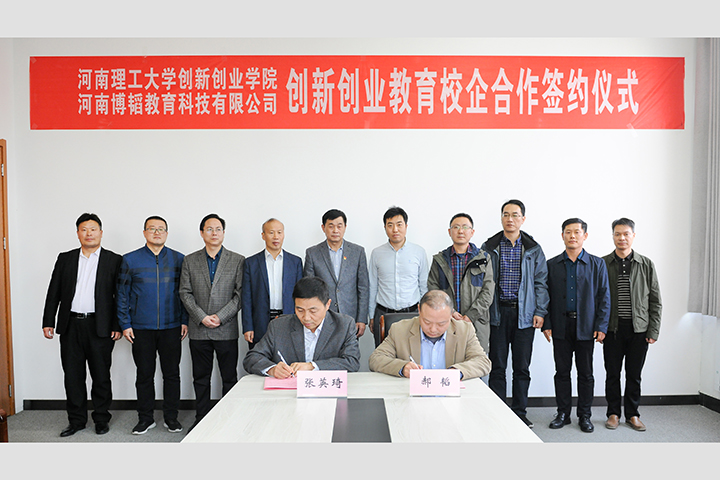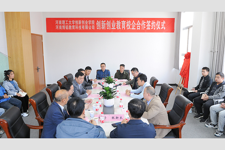 本网讯(通讯员 徐春浩 刘建学/文 记者 李为群 通讯员 郑智源/图)10月12日,学校创新创业学院(工程训练中心)与河南博韬教育科技有限公司校企合作签约仪式在创新创业中心320室举行。副校长赵俊伟、北京千种幻影科技有限公司总经理杨宝华出席签约仪式。北京千种幻影科技有限公司技术主管兼河南博韬教育科技有限公司总经理郝韬、副总经理杨柯,学校教务处、机械学院、电气学院、计算机学院、材料学院、创新创业学院(工程训练中心)相关负责人参加仪式,创新创业中心入驻团队指导教师代表、学生代表列席会议。仪式由创新创业学院(工程训练中心)副院长(副主任)徐春浩主持。