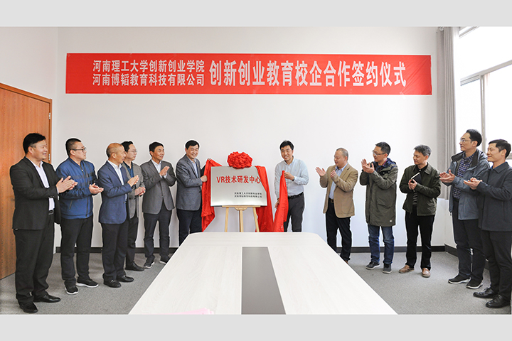 赵俊伟在致辞中指出,学校高度重视大学生创新创业教育,此次校企合作是应社会所需,与市场接轨、与企业合作,实现理论与实践相结合的重要举措,既可以让学校更好地服务社会、锻炼学生、启发教改、促进就业,又可以为企业发展提供智力支撑、发现选拔人才、挖掘社会价值。签约与揭牌仪式的举行,标志着学校与河南博韬教育科技有限公司在合作方面迈出了关键一步,将成为双方合作史上的起点。学校将本着“优势互补、合作共赢”的原则,合力共建“VR技术研发中心”,力争建出特色、建出质量、建出水平,为促进学校创新创业教育与企业科技研发做出积极贡献。希望双方聚焦目标、密切合作、勇于创新,携手推进合作向纵深发展,努力为国家培育更多更好的具有创新精神与创业能力的高素质人才。