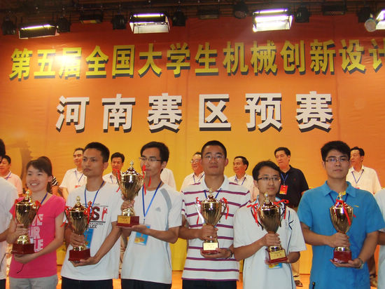 5月19日至20日,第五届全国大学生机械创新设计大赛河南赛区预选赛在河南工业大学成功举办,大赛的主题为“幸福生活—今天和明天”。河南工业大学、河南理工大学、郑州轻工业学院、中原工学院等7所省内高校近40项作品参加了本次大赛。经过激烈的角逐,大赛最终评选出一等奖12项,二等奖16项,三等奖8项,优秀组织奖4项。我校在此次大赛中收获丰硕,参赛作品“休闲趣味运动三轮车”、“ 脚踏式节能健身器”获得一等,“可拆卸多功能轮滑鞋”、“ 人力驱动家庭墙壁多功能清洁车”等四项作品获得二等奖,“无线遥控重力感应投篮机器人玩具”获得三等奖,其中 “休闲趣味运动三轮车”被推荐参加2012年7月份在解放军第二炮兵工程学院举行的第五届全国大学生机械设计创新大赛。