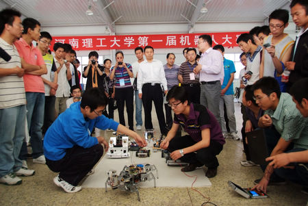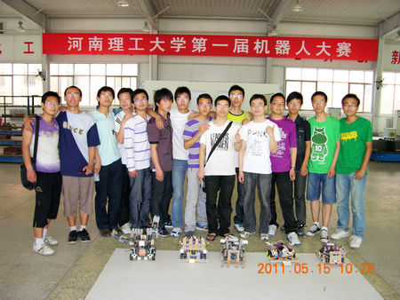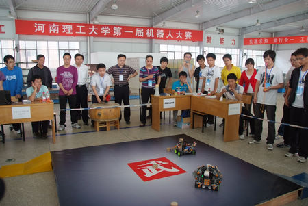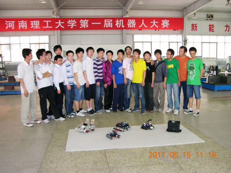 好学探索创新之路,力行挑战巅峰极限。为培养大学生的实践能力、创新能力、理论知识应用能力和协作精神, 5月15日上午8点,河南理工大学2011年机器人大赛在工程训练中心成功举行。此次大赛共吸引了来自电气、机械、计算机、万方学院的十二支代表团队参与,我校近百名师生到场观摩比赛。此次比赛由我校工程训练中心“力行”机器人俱乐部举办。