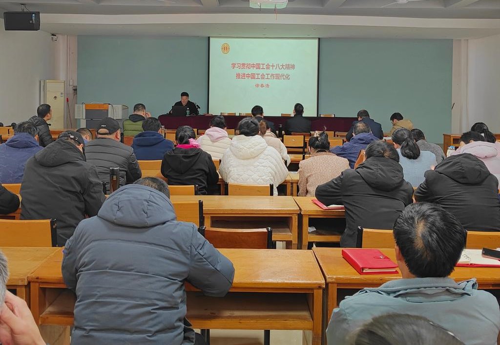 徐春浩从中国工会十八大概况、习近平总书记同中国工会全新一届领导班子成员谈话、中国工会十八大报告、《中国工会章程》修正以及推进中国工会工作现代化等5个方面对中国工会十八大精神进行了全面解读,要求广大教职工立足本职岗位、做好服务工作,用实际行动践行中国工会第十八次全国代表大会精神。