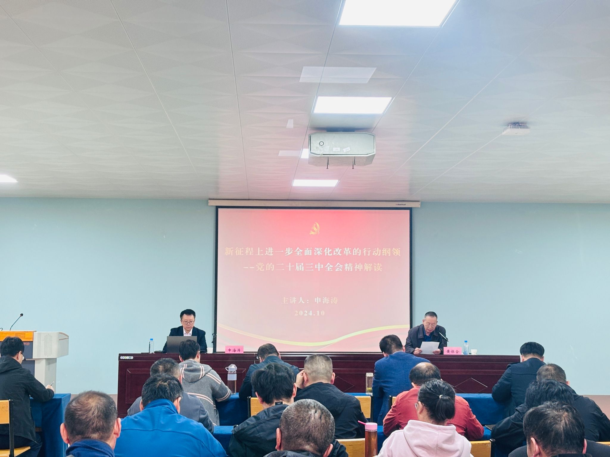 申海涛首先对党的二十届三中全会召开的盛况进行了简单介绍,随后他围绕为什么要进一步全面深化改革、进一步全面深化改革的目标方向、进一步全面深化改革的重大举措等三个方面对党的二十届三中全会精神进行了深度解读。他指出,党的二十届三中全会是在以中国式现代化全面推进强国建设、民族复兴伟业的关键时期召开的一次十分重要会议,彰显了以习近平同志为核心的党中央将改革开放进行到底的坚强决心和强烈使命担当。宣讲报告主题鲜明、内容丰富,对于全面领会党的二十届三中全会精神具有很强的指导意义。