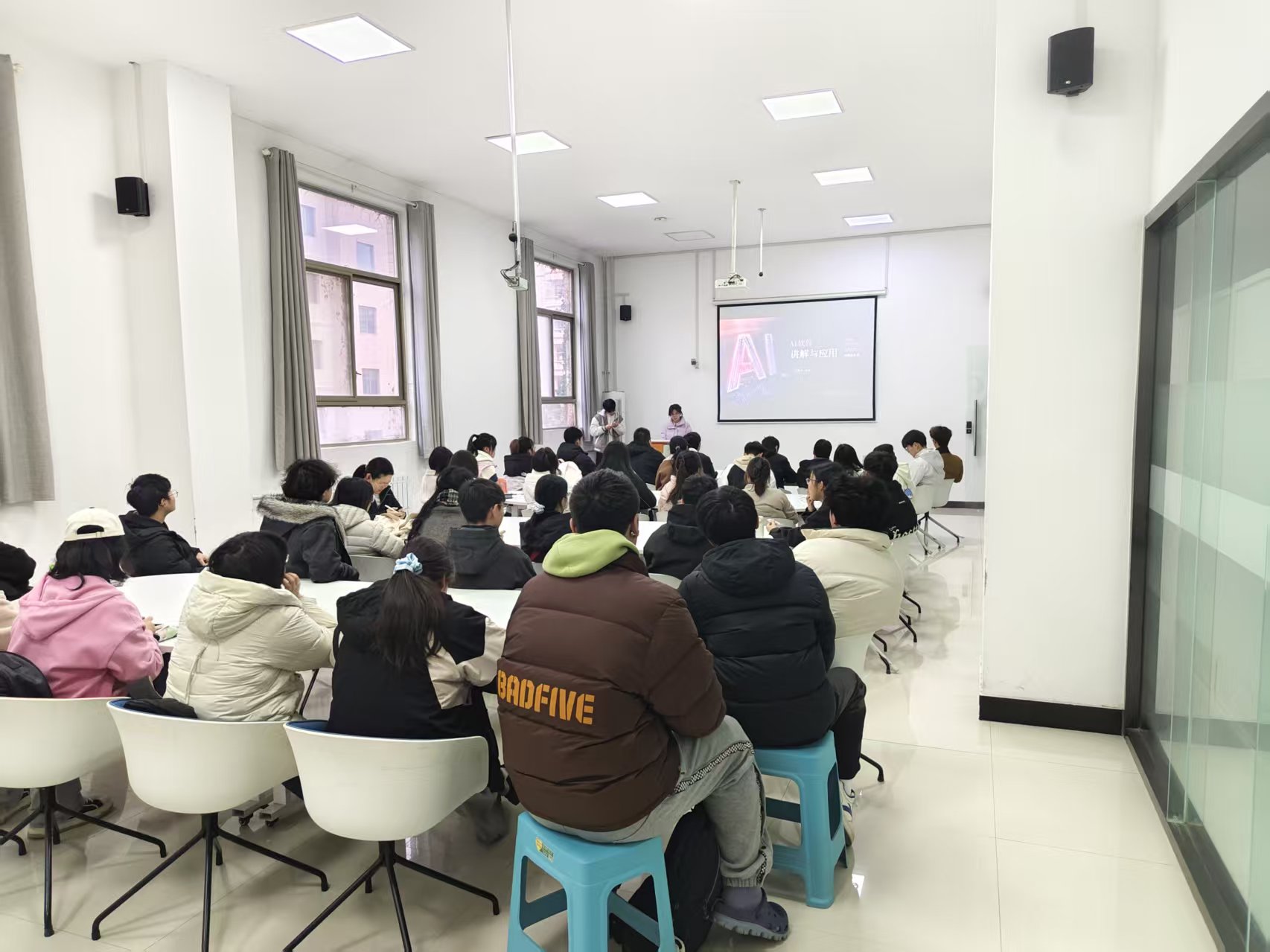 培训中,刘美杉围绕日常学习、科研辅助、双创竞赛实践等高频需求,系统讲解多款主流AI工具的核心功能与实操技巧,通过案例演示、步骤拆解、现场互动等方式,帮助同学们快速掌握基础操作与实用方法,从文字处理、内容生成到创新设计、数据分析层层递进,有效解决了学生学习与创新实践中的实际难题。秦欣如聚焦AI编程主题,结合理论讲解、案例分析与实操训练,讲解AI工具使用、编程基础与项目开发流程。通过沉浸式学习与交流研讨,同学们拓宽了技术视野,提升了运用AI技术解决实际问题的能力。