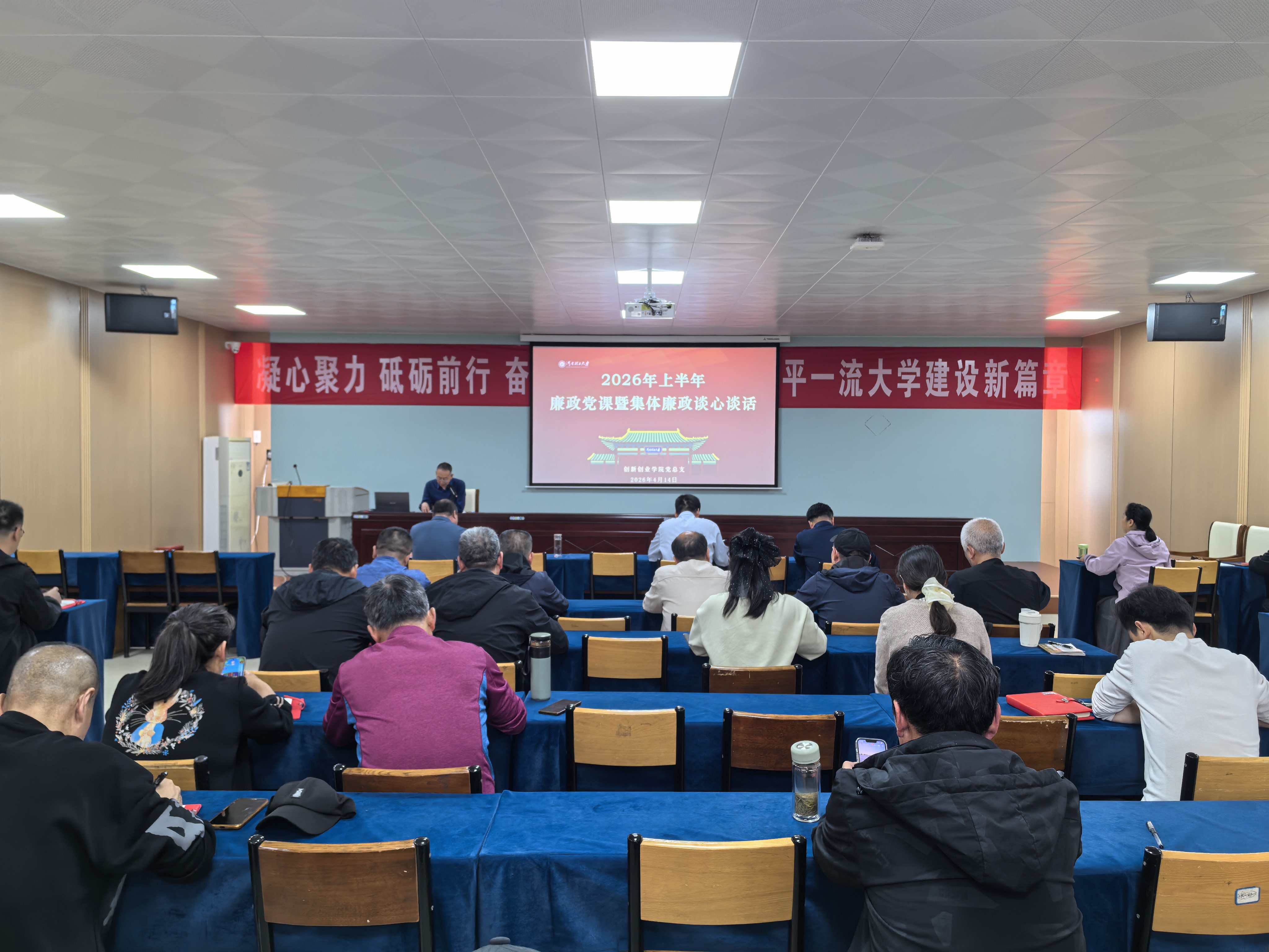 为深入学习领会习近平总书记关于党的建设的重要思想和关于全面从严治党的重要论述,进一步筑牢全体党员干部职工廉洁自律思想防线,4月14日下午,创新创业学院(工程训练中心)在404多媒体会议室举办2026年上半年廉政党课暨廉政集体谈心谈话会。会议由学院(中心)党总支书记黄保金主持,全体教职工参加。